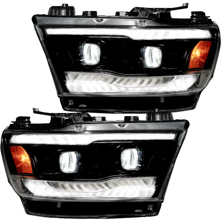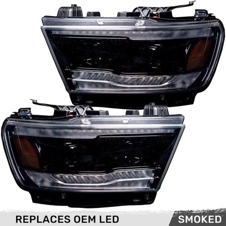 Dodge 19-23 RAM 1500 LED Projector Headlights Ultra High Power Smooth White OLED DRL & Scanning Amber LED Turn Signals w/ Startup Light Sequence (Replaces OEM LED Only) - Smoked / Black