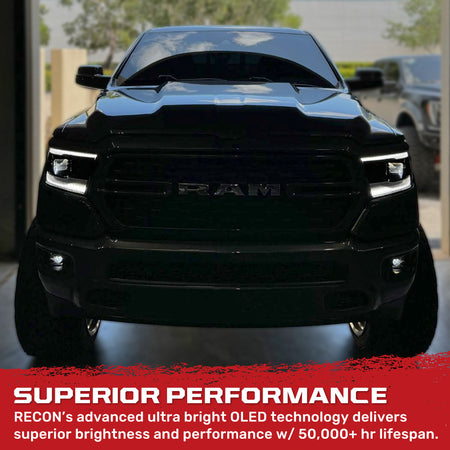 Upgrade your 2019-2023 RAM 1500 with RECON's Ultra High Power Full LED (Low & High Beams) Projector Headlights, featuring ultra-high power smooth White OLED daytime running lights, scanning switchback high-power amber LED turn signals, and a sleek smoked / black style with startup lighting sequence! These LED headlights not only enhance the appearance of your truck but also significantly improve driver visibility.