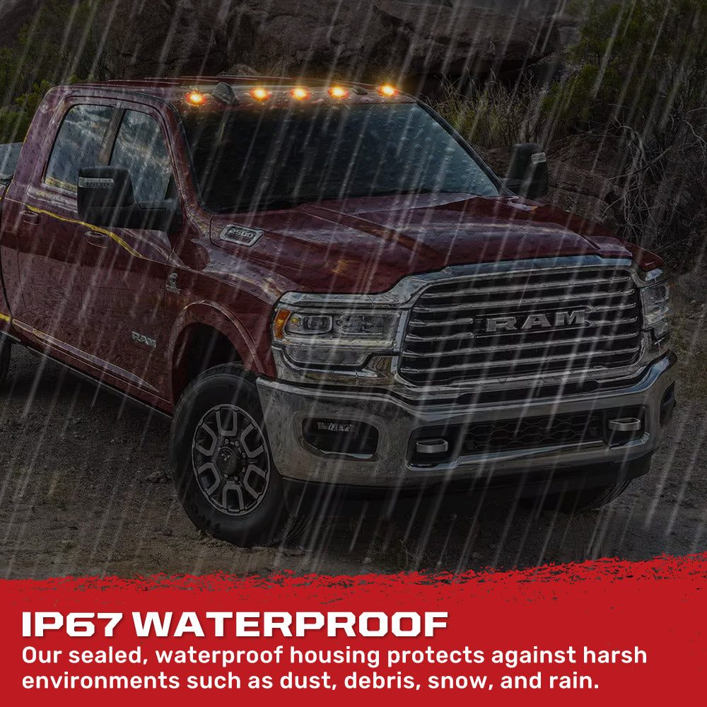 Show off your Dodge RAM pride with this high-performance 5-Piece LED Cab Roof Light Kit. Featuring a bold, sleek smoked or clear lens and ultra-bright strobing LED lights this kit delivers both style and functionality. From the moment you open the box, the smoked cab light lenses and precision fit will impress you, ensuring a seamless install on your truck. Built to last, the RECON LEDs are energy-efficient, offer a 50,000+ hour lifespan, and are housed in an impact-resistant, military-grade ABS plastic lens for unbeatable durability and performance.