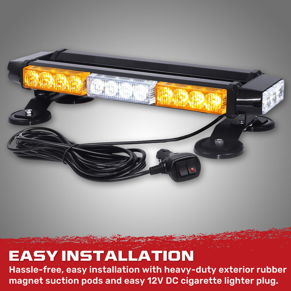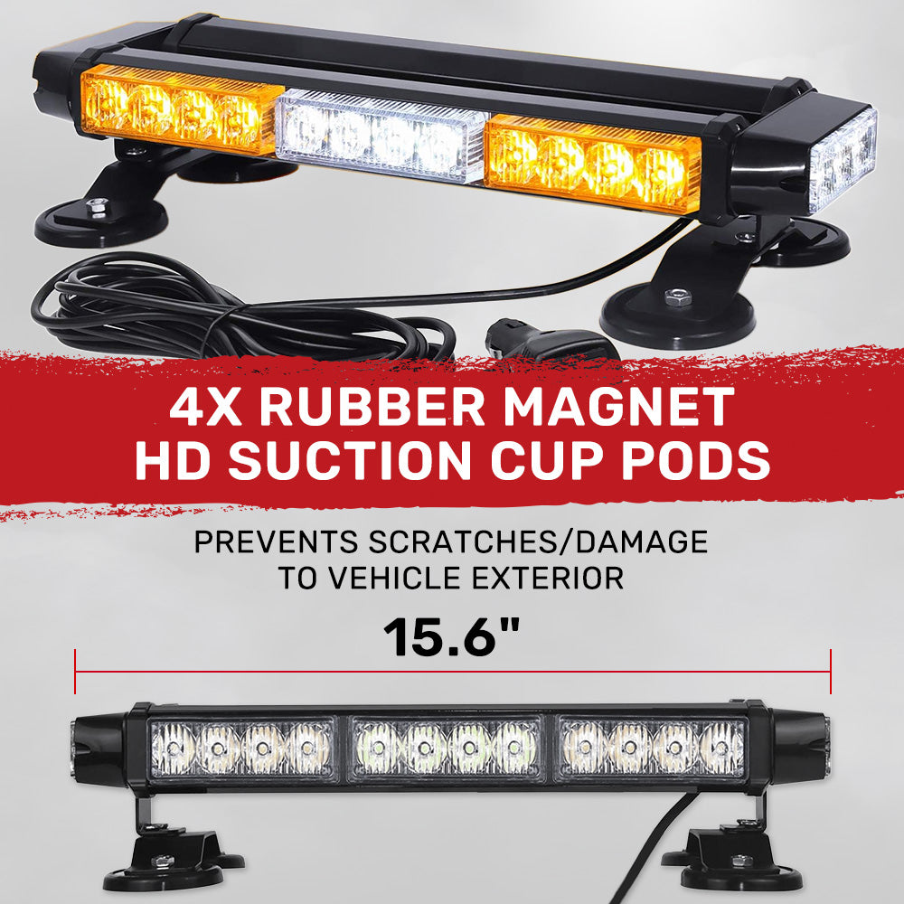 Exterior Roof Mounted 15" Emergency LED Strobe Light Bar in Amber & White - HD Magnetic Suction Cup Installation w/ 7 Light Functions