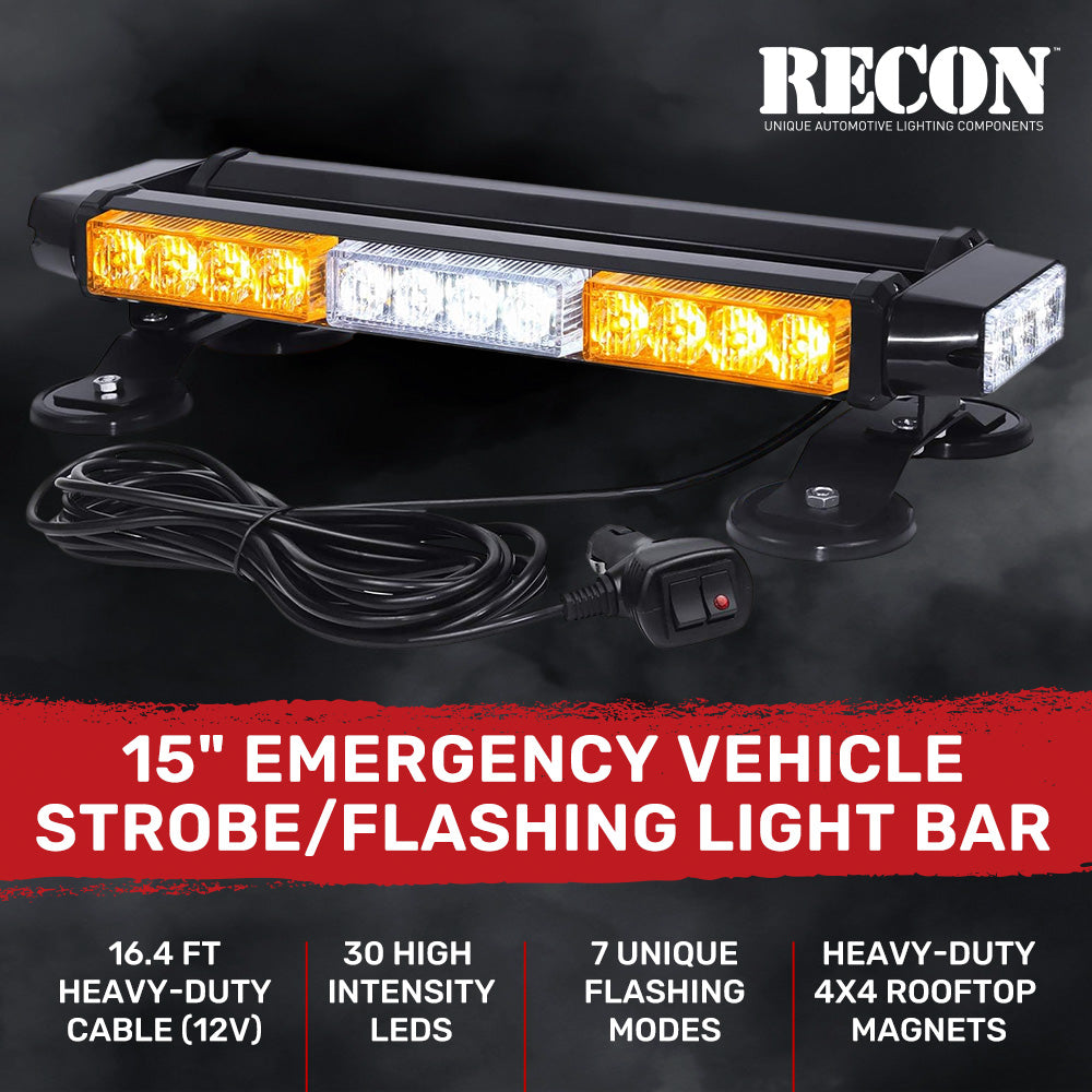 - RECON 15" Emergency LED Strobe Light Bar Amber & White w/ 7 Lighting Functions - Includes Heavy-Duty Magnet Rubber Suction Cups and A/C Adapter Plug & Play 16.4ft Cord