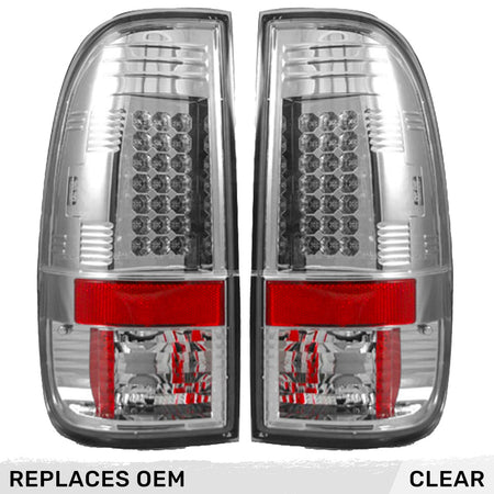 Upgrade the look of your 2008–2016 Ford Super Duty (F250, F350, F450, F550) with the hottest new LED tail lights from RECON. Built with ultra high-power LEDs, these are the brightest we offer, paired with a distinctive lens color that’s guaranteed to turn heads. Choose from Smoked, Red, or Clear lens options to match your style. These RECON tail lights are designed to work with your factory OEM halogen reverse bulbs, but for maximum brightness, you can upgrade to RECON’s Ultra Bright White LED Reverse Bulbs — #264225WH (3W) or the Ultra High Power #264226WH (6W) — for incredible rear illumination.