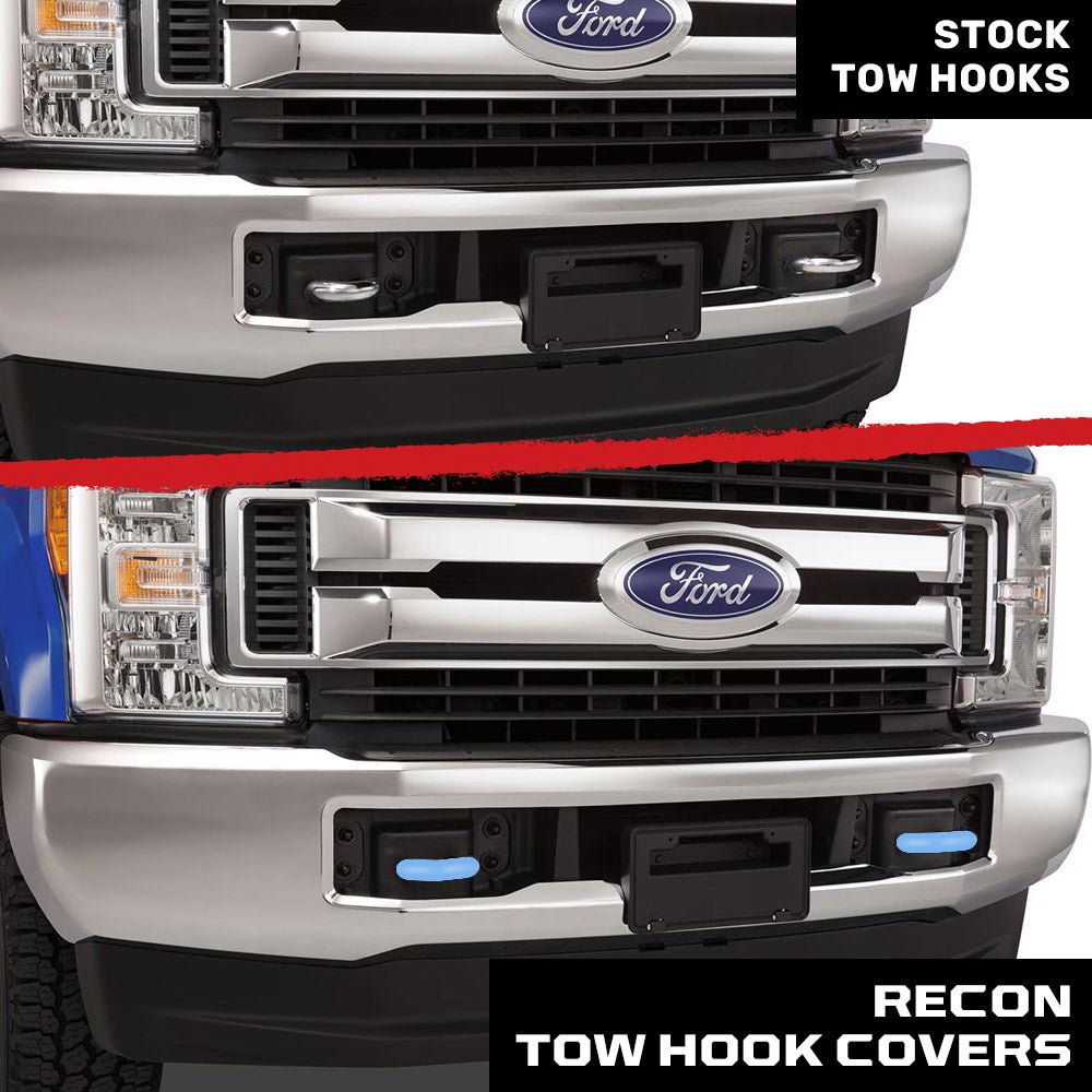 Upgrade the look of your 2015-2023 Ford F150 or Raptor's factory tow hooks with our new high strength tow hook covers engineered from 100% silicone rubber available in multiple colors in both standard (Non-LED) and LED Lit versions to help customize your truck and stand out from the crowd. RECON Ford F150 & Raptor Tow Hook Covers are IP67 Waterproof rated and UV treated and engineered to withstand prolonged sun exposure to prevent fading and degradation, ensuring lasting quality and style.