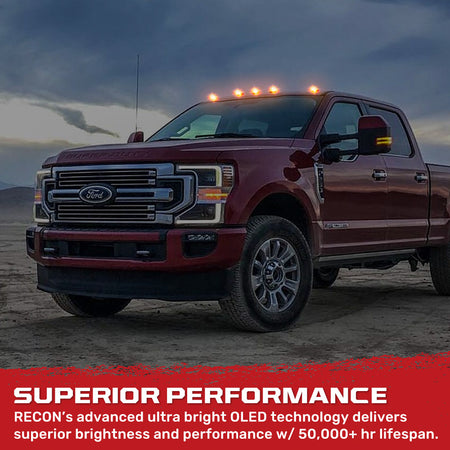 Ready to upgrade your 2017–2022 Ford Super Duty’s style? Replace those dull factory OEM cab lights with our modern, heavy-duty advanced OLEDs. Available in multiple lens and color options to perfectly match your truck’s look. For the first time ever, RECON’s ultra high-powered OEM replacement cab lights offer both front and rear-facing visibility, instantly grabbing attention and enhancing illumination from every angle. Designed exclusively for factory-equipped Ford Super Duty models, this upgrade takes your truck’s lighting and presence—to the next level.