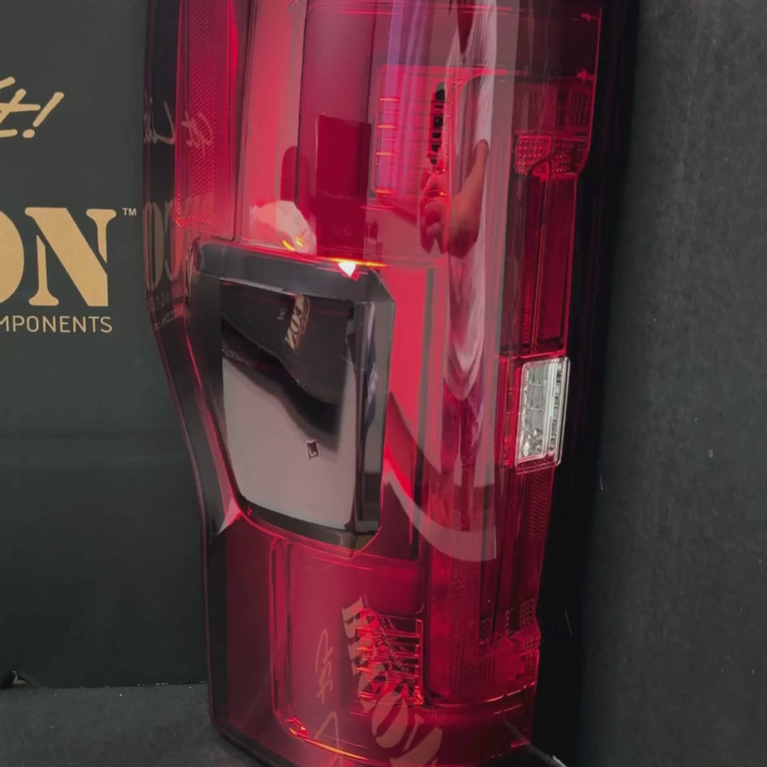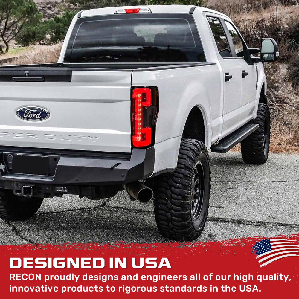 Give your 2017–2019 Ford Super Duty a bold upgrade with RECON’s brightest OLED tail lights, available in smoked, dark red smoked, red, and clear lenses. Smoked Lens (#264299BK) features a dynamic start-up light greeting sequence, combining cutting-edge style with top-tier performance. Built for high visibility and durability in any condition. Compatible with trucks that came with factory HALOGEN tail lights only; if your truck came with factory LED w/ BLIS, you will need part #264299LED series.