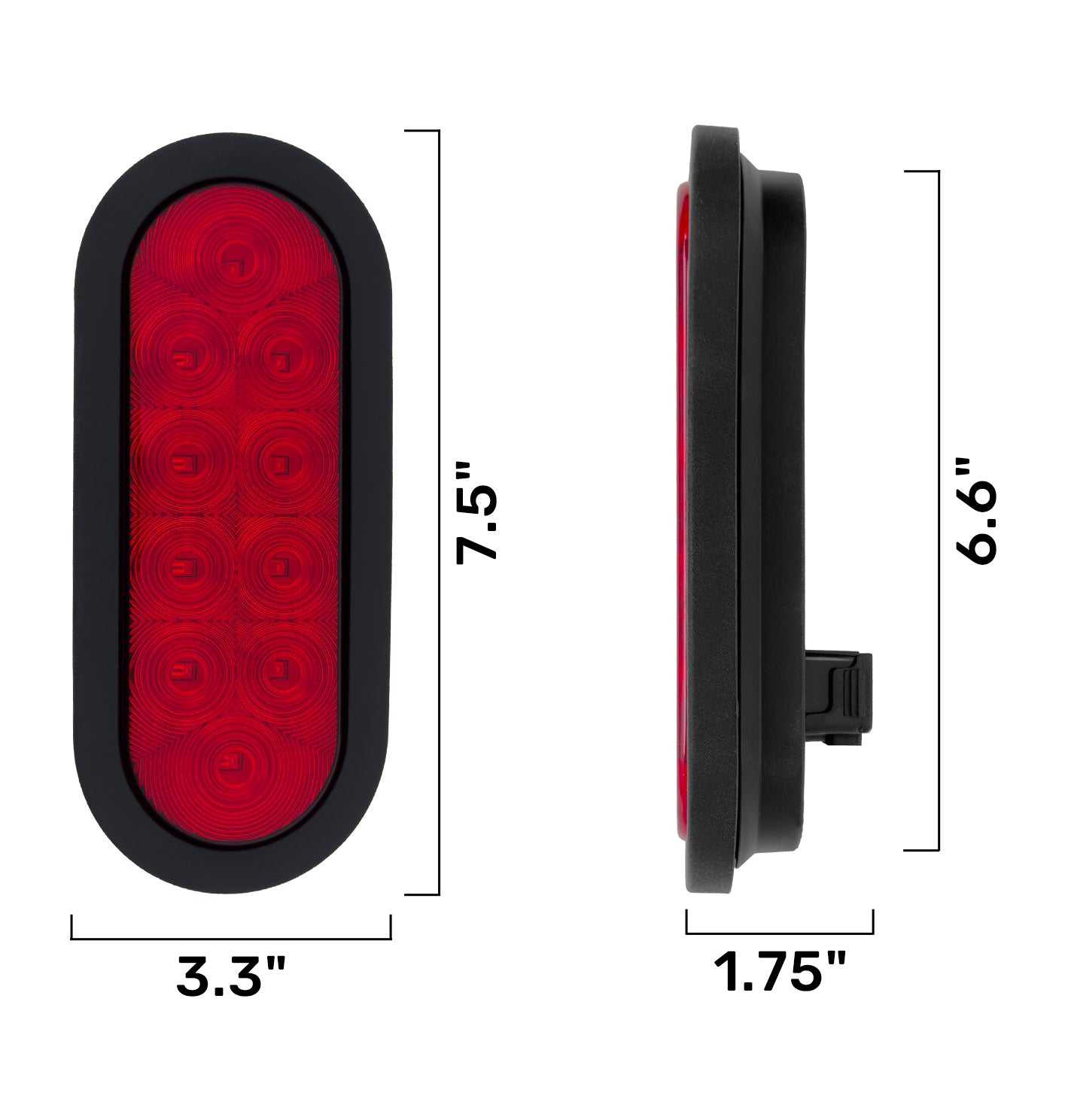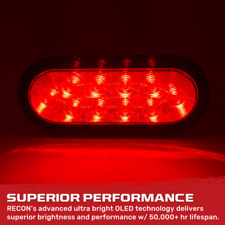 RECON 2-Piece Universal 6" LED Oval Cargo Trailer Lights feature 10 premium SMD LEDs for ultra-bright red illumination for turn and brake signals, with a lighter glow for the tail running lights. Designed for enhanced visibility, they ensure a safer driving experience across various vehicles. Compatible with all 12V DC 4-wire vehicle systems, this light functions as a turn signal, brake light, and tail light for trucks, trailers, tractors, and more. It is widely used with cargo carriers. Be sure to check the hole size before purchasing. Hole size for surface mount: 6.6” x2.5” x 1.75”.