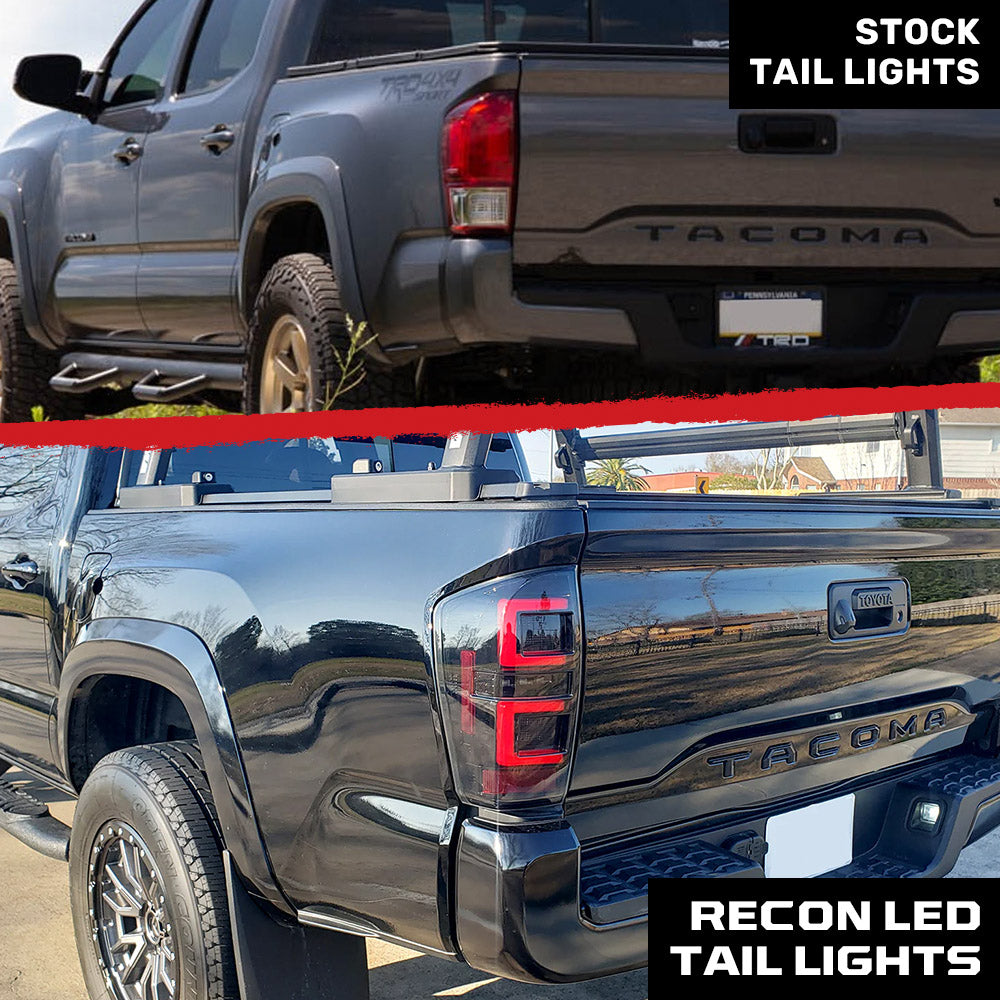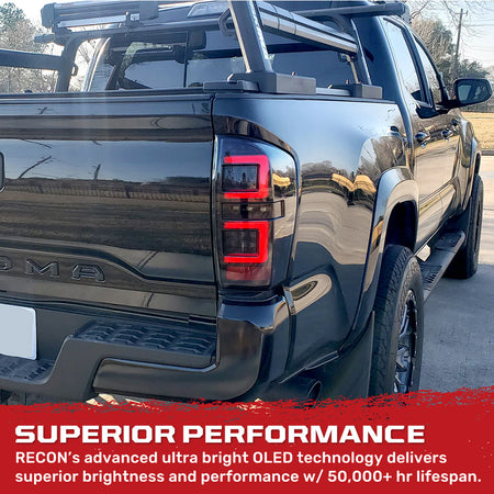Transform your 2016–2023 Toyota Tacoma with RECON’s ultra bright OLED tail lights. Featuring a sleek smoked lens and vibrant red running and brake lights, these lights not only enhance your truck’s style but also dramatically improve visibility and safety on the road. Say goodbye to the bland factory setup and make your Tacoma stand out with bold, modern lighting.